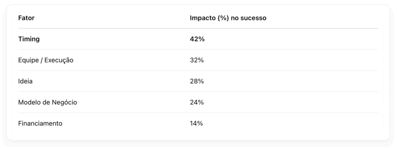 Esse vídeo fez tanto sentido para mim porque, na época, ao observar amigos próximos que também queriam montar uma empresa, percebeu que o foco deles era sempre a ideia, aquele discurso clássico de “minha ideia é milionária”. Muitos também se preocuparam em como captar dinheiro com amigos e familiares, mas poucos entenderam que o mais importante era saber ler o cenário, avaliar o momento e fazer um trabalho real de validação para entender se o projeto estava estruturado da forma certa e, principalmente, no tempo certo para ser lançado no mercado. Pois segundo o Bill Gross 42% do sucesso de uma startup está no timing.